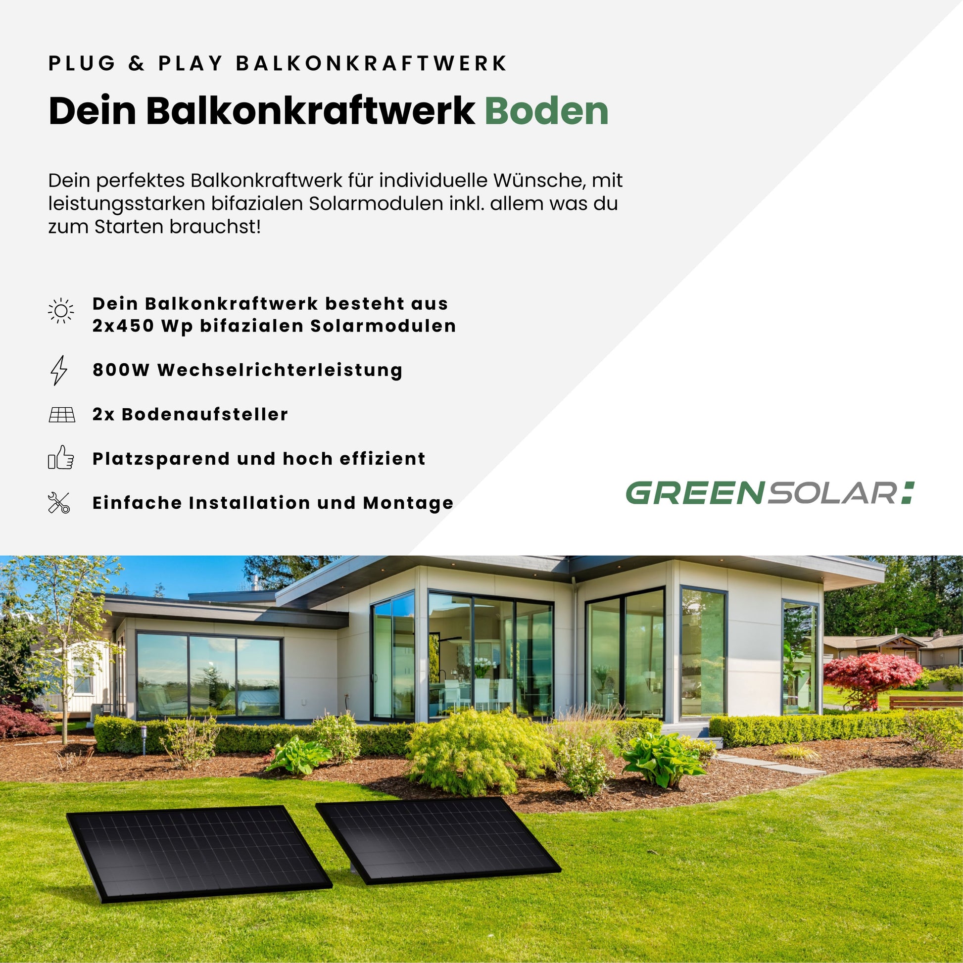 Mit dem Balkonkraftwerk Boden 900/800 bifazial holst du dir deine eigene Stromquelle direkt nach Hause – ganz ohne bauliche Montage. Dieses leistungsstarke Plug & Play-System eignet sich perfekt für die Aufstellung im Garten, auf der Terrasse oder auf einem Flachdach. Du brauchst keine technischen Vorkenntnisse: einfach auspacken, die beiden Solarmodule in die Bodenaufsteller einsetzen, mit dem Wechselrichter verbinden – und schon produzierst du deinen eigenen Strom.